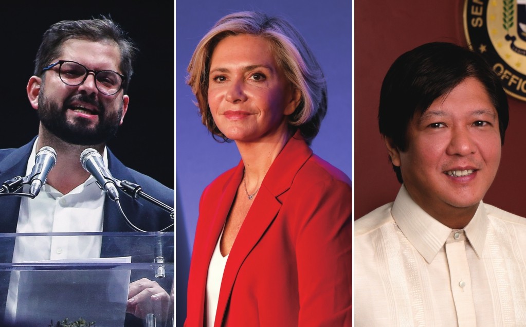 左起:智利新当选的总统加布里埃尔·博里奇、法国总统候选人瓦莱丽·佩克雷斯、菲律宾总统候选人小马科斯 岁末假期后,最猛烈的疫情风暴刮遍欧美。美国“一周平均新增确诊数”突破每天90万例,人口只有美国1/5的法国,也逼近了周均每日20万例。 疫情仿佛社会生活的暂停键,但政治生活尤其是大选议程,很难取消或推迟。疫情头两年主要国家的大选,已经推出的新面孔并不多,美国的拜登以前是副总统,德国的