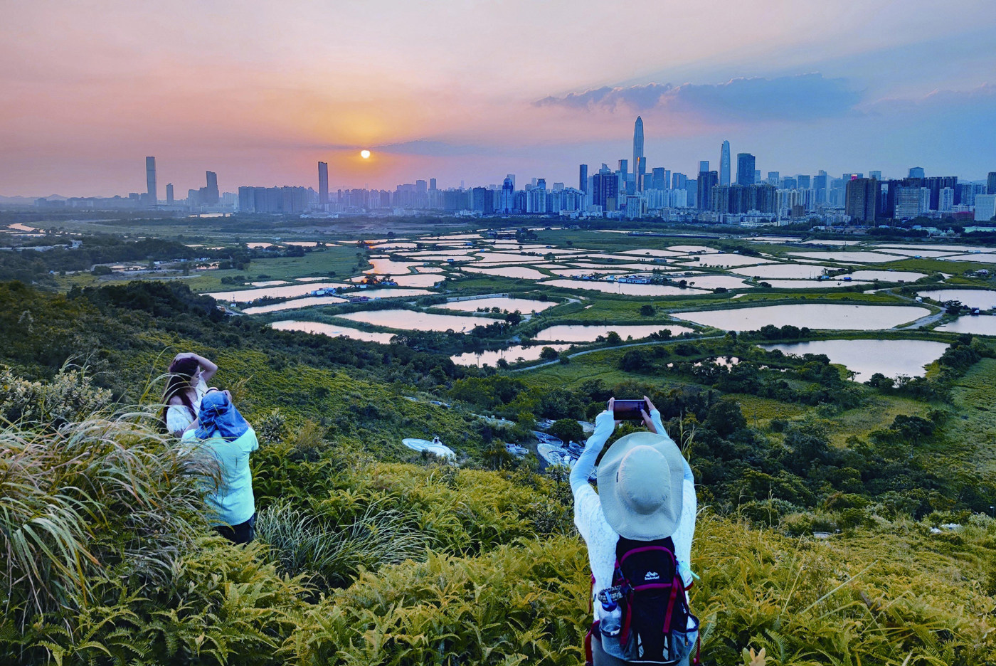 2021年10月5日,香港市民在马草垄拍摄新界北落日,远处是深圳的建筑群 2021年10月,香港特别行政区行政长官林郑月娥发表了任内第五份,也是本届香港特别行政区政府最后一份《施政报告》。《施政报告》提出,将建设涉及面积达300平方公里、可容纳250万人居住、就业岗位增至约65万个的北部都会区。同期,特区政府还公布了《北部都会区发展策略》,引发外界对于香港北部发展前景,及与周边地区进