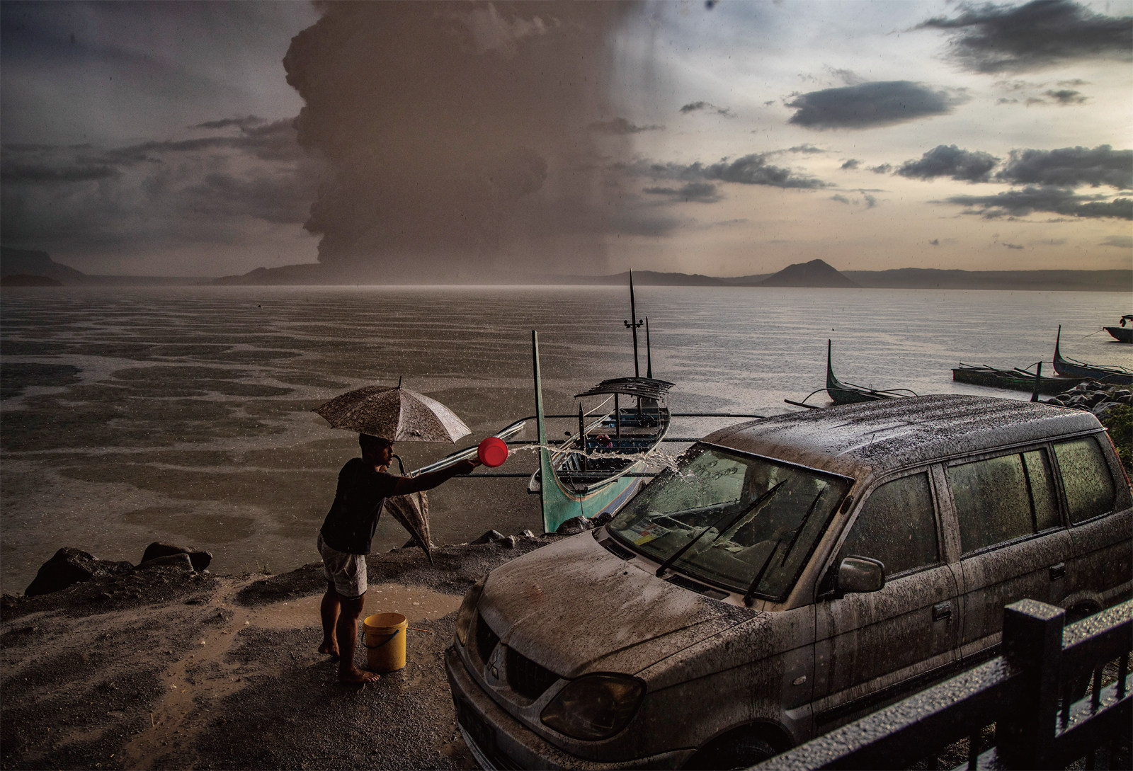 2020年1月12日,菲律宾吕宋岛上的塔阿尔火山喷发,居民泼水清理洒落在车上的灰烬。 1. 2020年1月12日,火山喷发后,伴随着出现了火山雷暴。 2. 街上的人使用塑料袋抵挡雨水和灰烬。 3. 火山喷发后,向空中喷洒了高达14公里的灰烬。 夹杂着闪电,沉寂的火山灰被喷向14公里的高空。阵雨倾盆,雷暴接踵而至。2020年1月12日,菲律宾吕