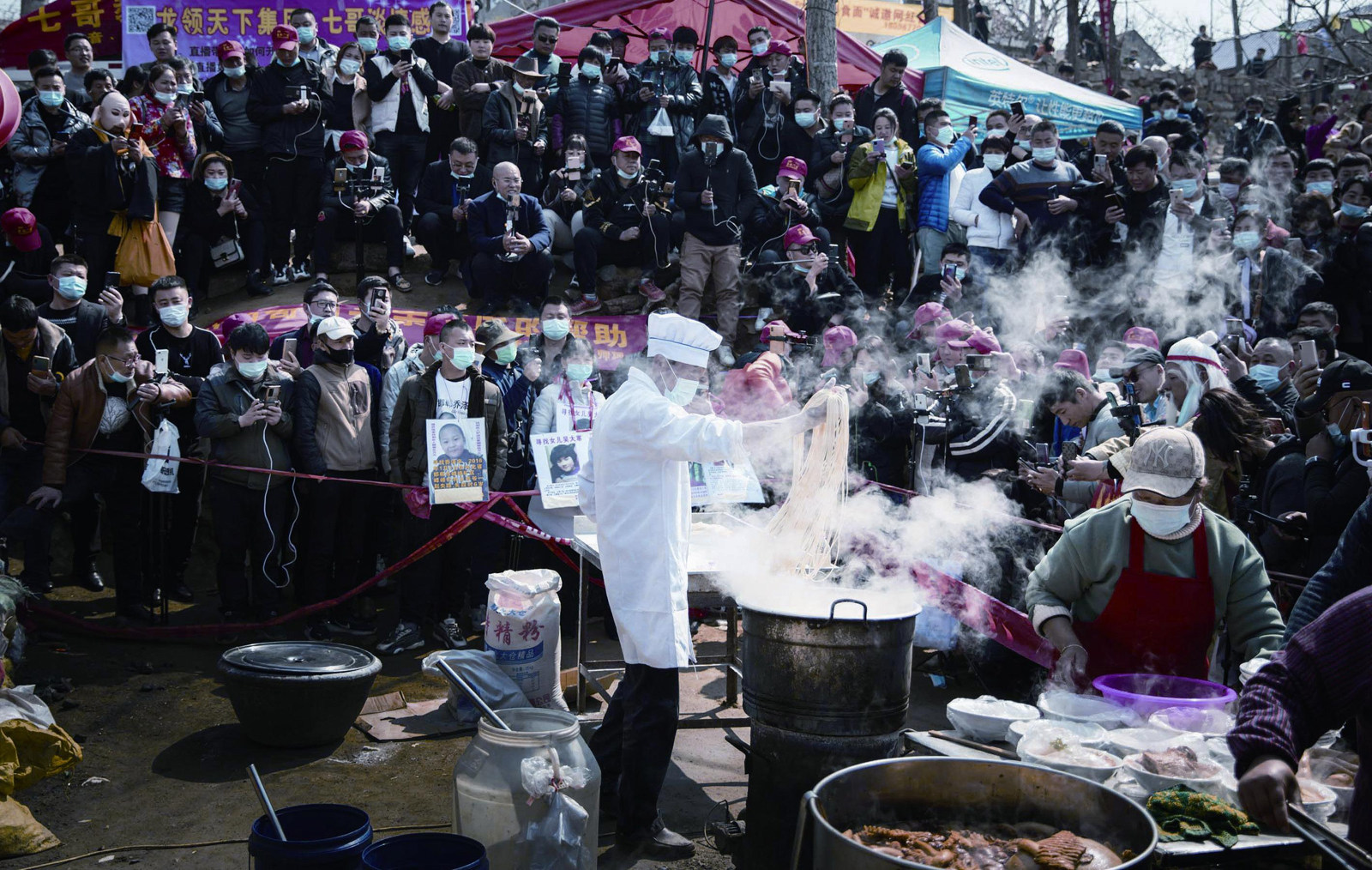 2021年3月12日,山东省临沂市费县马蹄河村,“拉面哥”程运付在家门口拉面,观众、主播们把他和家人层层围住 程运付为何走红?网络流量聚焦,会怎样改写他的个人命运,以及一个落后村庄的历史走向? 你或许更熟悉程运付的另一个名字,拉面哥。关于他,那则最广为流传的故事是,他卖了15年拉面,3元一碗,从未涨价。 大多数关于他的报道,都在呈现土味网红主播聚集成群的奇观。似乎没有人在意3元一