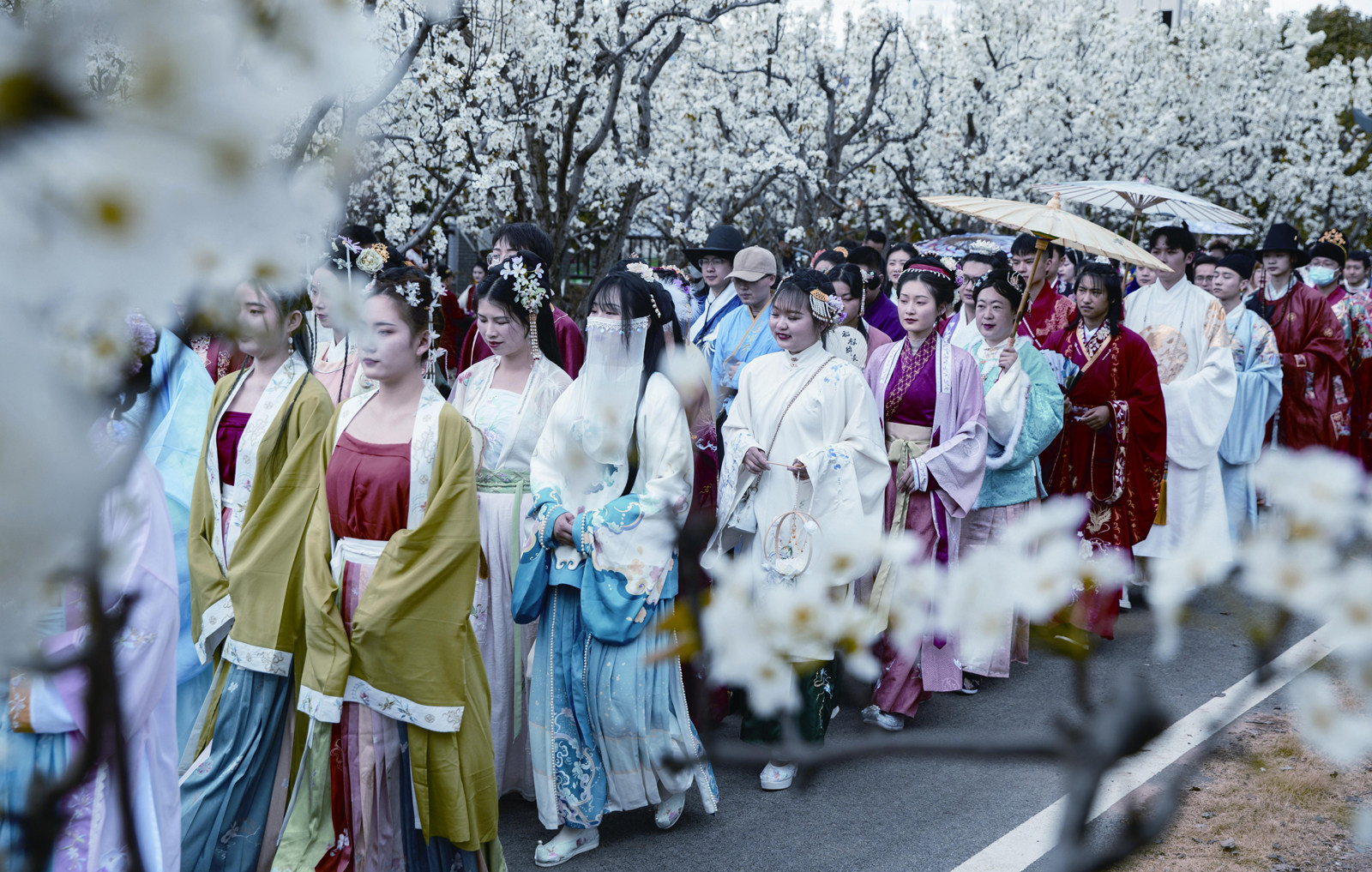 2021年3月6日,四川雅安,汉服爱好者在汉源县九襄镇参加活动 “现在喜欢汉服的年轻人怪得很,不是想穿,只是想有。”尹启航在3台印花机噼里啪啦的交织轰鸣声中扯着嗓子对记者喊,脸上露出哭笑不得的表情。 尹启航的汉服小工厂开在山东曹县大集镇中心的淘宝园区,他的顾客以15~20岁的小姑娘为主,很多三四年级的小学生买家讲起款式来头头是道,什么褙子、马面、曲裾……尹启航听得云里雾里,他索性赠