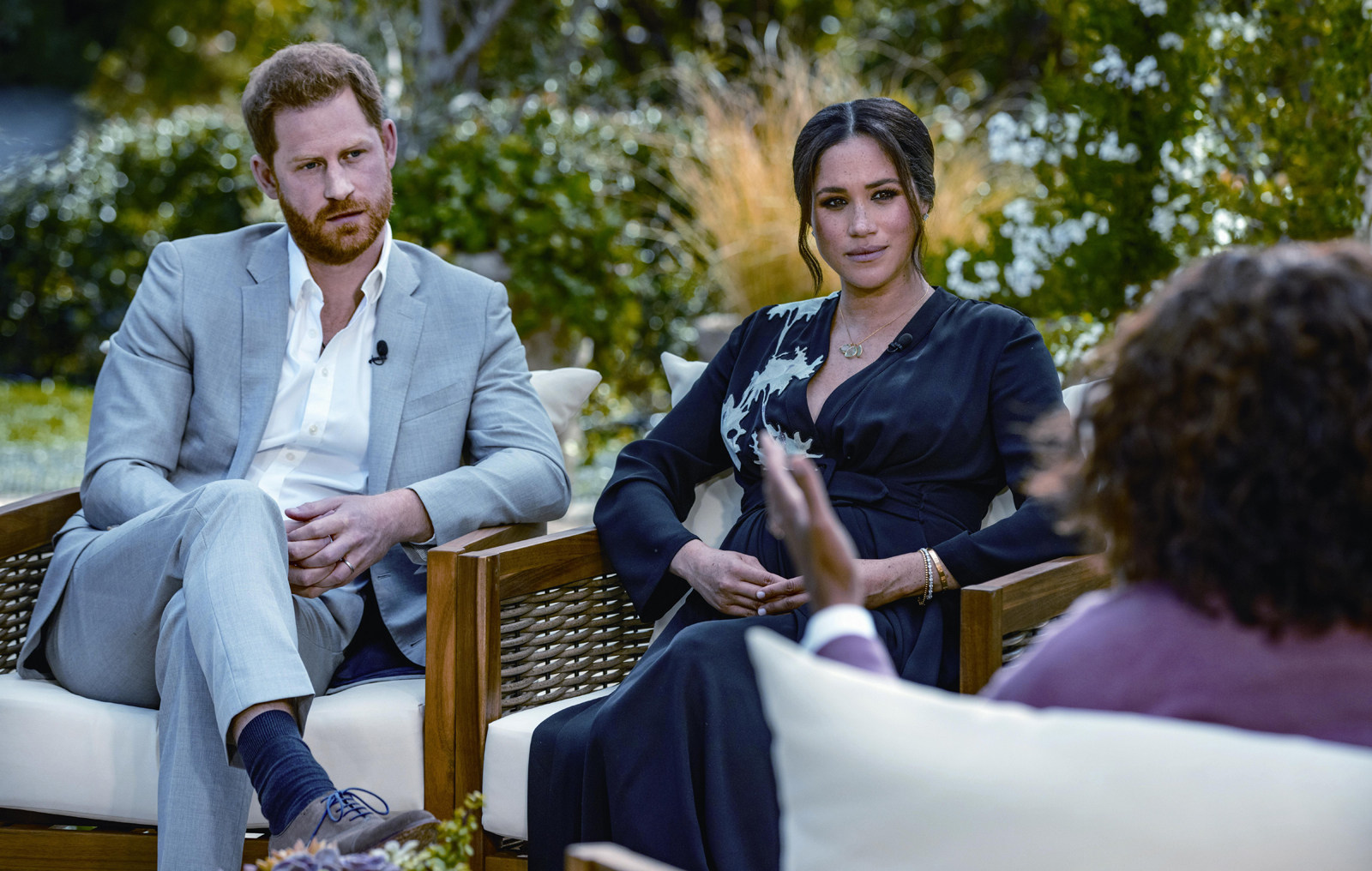 2021年3月6日,哈里和梅根夫妇接受采访 黑白混血、离过婚、早年参演过《金装律师》系列美剧的梅根·马克尔,借着脱离英国王室将满一年和怀上二胎(女儿)的时机,和丈夫哈里一道接受美国脱口秀女王奥普拉的专访,倾诉在英国王室得到的不公正待遇,一时引爆英美舆论界。据英国《每日邮报》报道,梅根利用这次收视率巨大的专访所带来的不菲人气,谋划着进军政界,甚至被英国工党官员传言有可能竞选下届美国总统