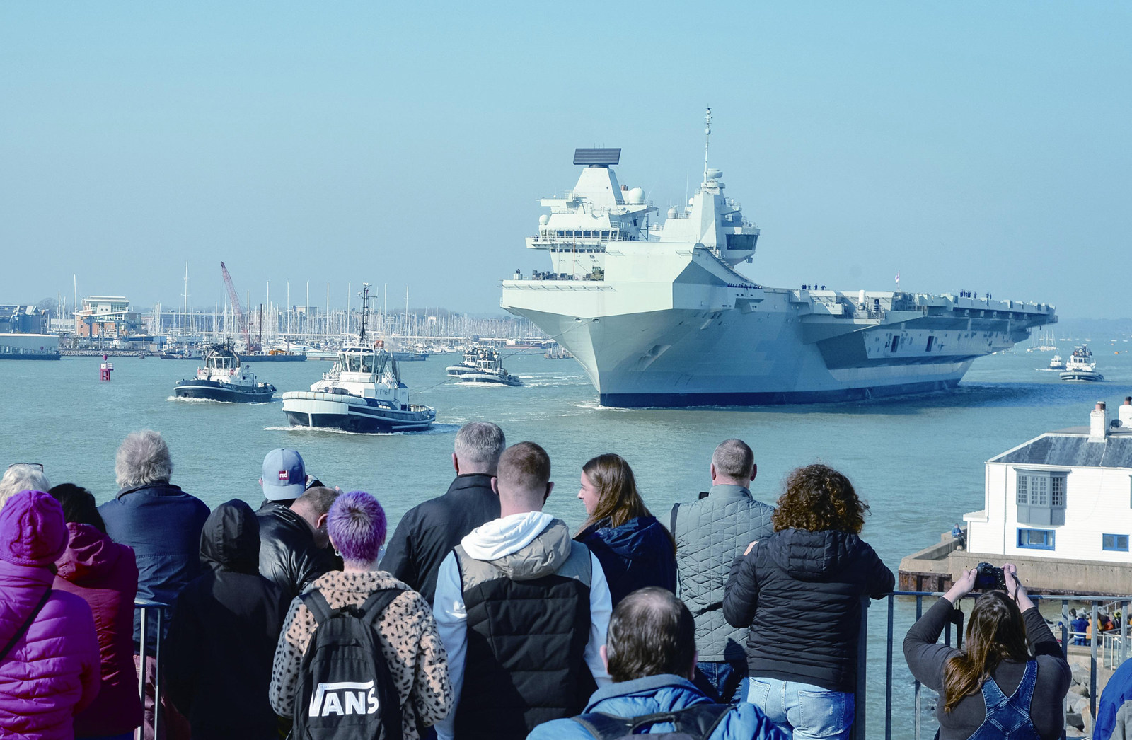 2021年3月1日,停泊在英国朴次茅斯的“伊丽莎白女王”号 在一番高调炒作之后,部分欧洲国家的军舰竞相开向亚太地区,试图在南海“留个影”。法国“雷鸣”号两栖攻击舰编队已在路上;英国“伊丽莎白女王”号航母打击群加紧训练,即将踏上遥远的亚太征途;德国则将在其后派一艘护卫舰赶来……加上美国、日本、加拿大、澳大利亚等国正在或拟派舰艇巡航南海,舆论场出现了警惕“新八国联军”的声音。 3月3日