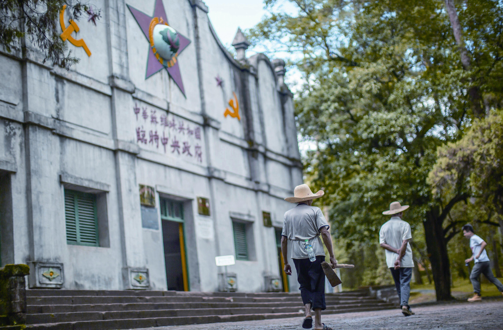 江西赣州,当地群众走过“中华苏维埃共和国临时中央政府”旧址 如果不是那幢比周围建筑高一截的客家祠堂正面悬挂的两颗黄澄澄的五角星,人们以朝圣的心情重走“红都”时,便难以将眼前的建筑与苏维埃政府联系起来。 1931年10月,瑞金县委书记邓小平曾陪同中央革命军事委员会副主席项英走遍了县城,没有找到能容纳千人以上的场所。最后还是选定了邓小平推荐的明代建筑。 一个月后,一个具有国家形态的中