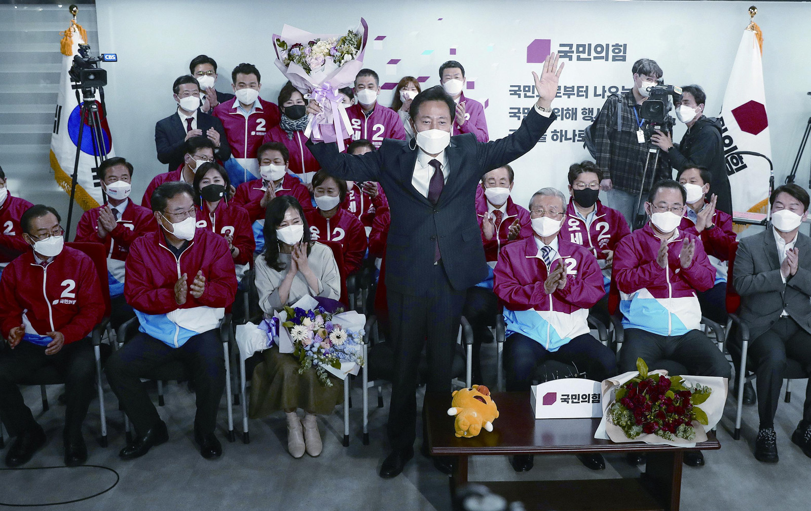 2021年4月7日,韩国首尔,新当选首尔市长吴世勋正在庆祝选举结果 距离下届韩国大选已不到一年,总统文在寅及执政党的支持率连番触底。近期,韩国两大市的选民更是用选票给了执政党沉重一击。 4月8日,首尔、釜山市长补选结果出炉。执政党共同民主党遭遇惨败,最大在野党国民力量党大获全胜,以高票斩获两大市长之位。 鉴于此次补选被视为“大选前哨战”,这个结果为执政党的大选前景亮起红灯,韩国政