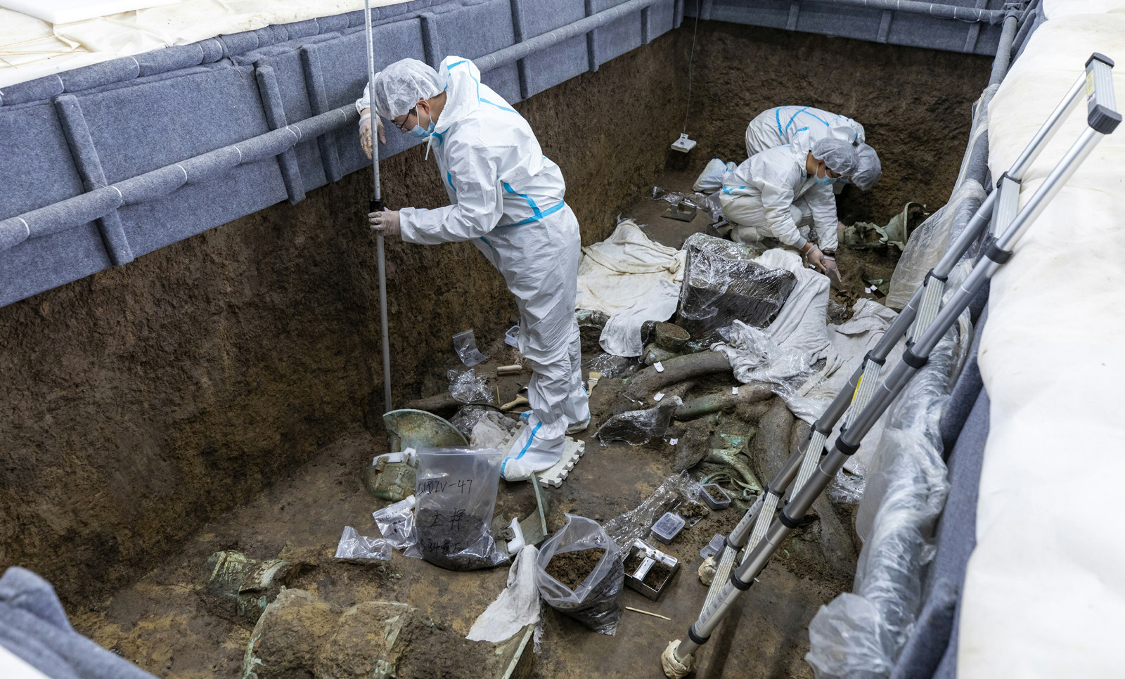 2021年3月10日,在三星堆遗址考古发掘现场3号“祭祀坑”,考古人员用全站仪为新发现的文物定位 今年3月20日,“考古中国”在成都发出通报,称在三星堆遗址新发现了6座三星堆文化“祭祀坑”。像上世纪80年代发现三星堆遗址时那样,“沉睡三千年,一醒惊天下”,话题在热搜榜蝉联了好几天。 新发现的“祭祀坑”中,现已出土了大量文物,闪闪发亮的金面具,规格惊人的青铜面具和青铜神树,还有数百根