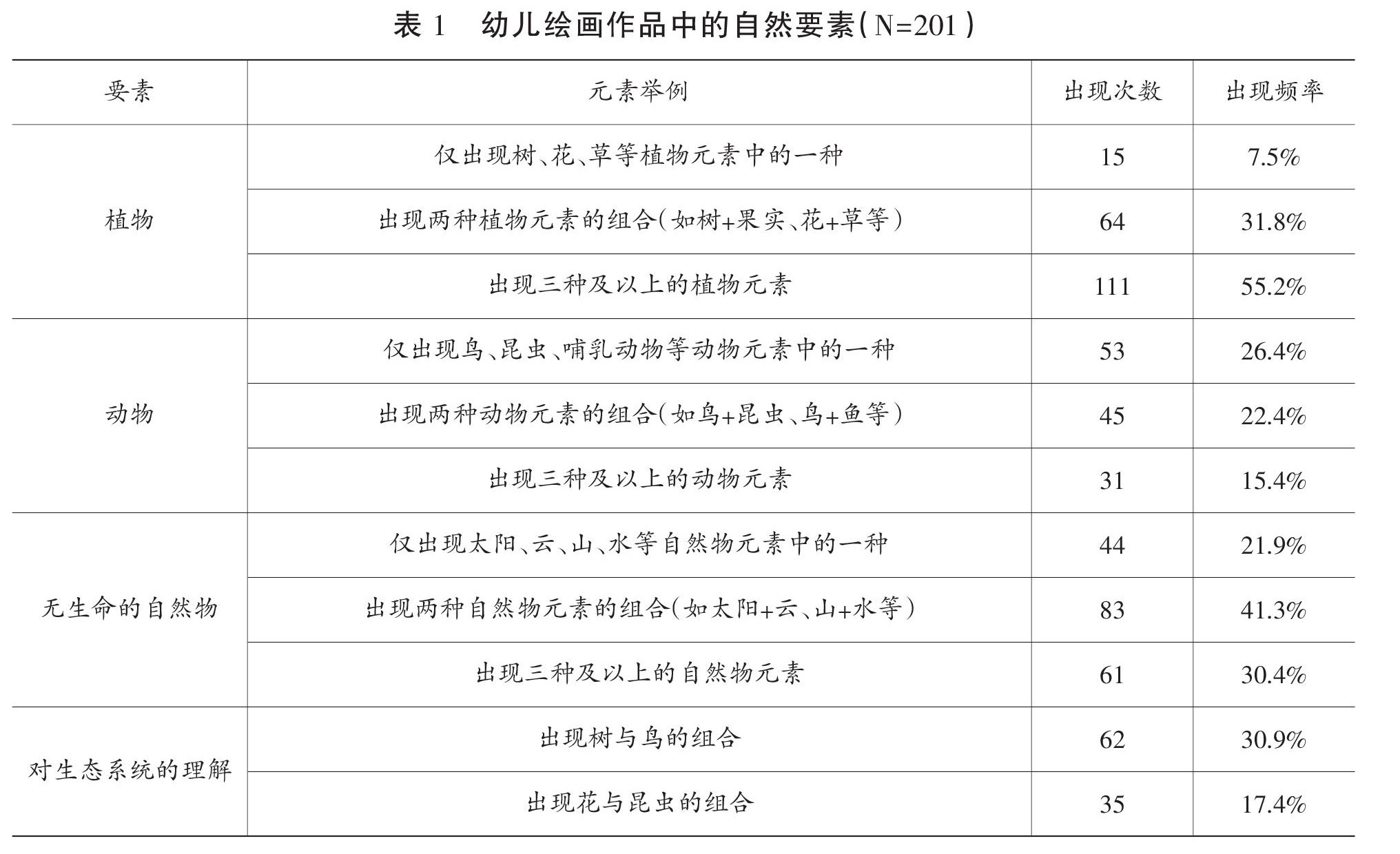 [摘 要] 儿童的自然观对其成年后的环境态度和环境行为有着重要影响。本研究采用现象图析学的方法,对上海主城区201名大班幼儿的绘画作品和访谈数据进行分析,结果发现:城市学前儿童心目中的自然是动植物与环境和谐共生的外部世界;自然是城市学前儿童自由玩耍的地方、户外休闲与运动的场所,以及感知世界和探索发现的媒介;城市学前儿童初步形成了朴素的自然知识观,但其自然伦理观、自然审美观和自然保护观还有待发展。为