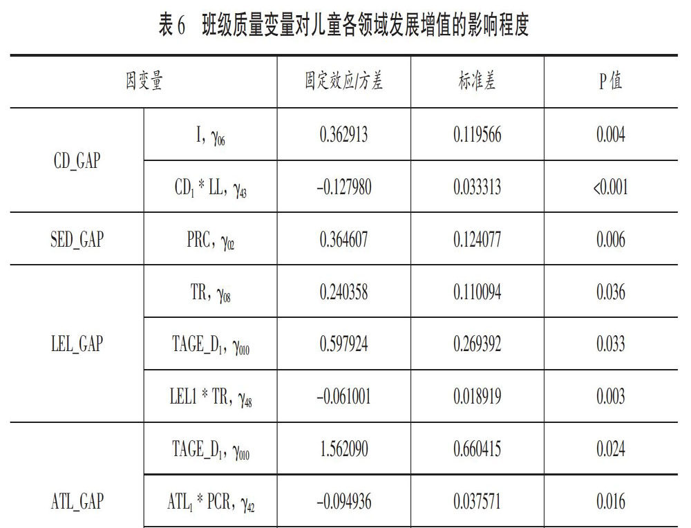 [摘 要] 儿童发展是衡量学前教育有效性的重要维度,基于多层线性技术的增值评估模型是探讨学前教育有效性的重要方法。本研究采用追踪研究设计,运用增值评估模型,以来自上海12所幼儿园的665名儿童为研究对象,重点探讨在控制个体和家庭背景因素后,班级质量对儿童各领域从中班到大班发展增值的影响。结果发现,教师自我感知的教研支持度对儿童语言与早期阅读领域的发展增值影响显著,并对语言与阅读起始水平低的儿童的语