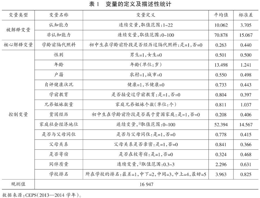 [摘 要] 学前阶段家庭照料质量在个体人力资本积累中扮演着重要的角色。本研究选取中国教育追踪调查(CEPS)2013—2014学年数据,采用倾向得分匹配法考察了学前阶段隔代照料对初中生认知能力与非认知能力的影响。结果发现学前阶段隔代照料可以显著促进初中生认知能力的发展,并主要体现在城市户籍、非贫困家庭初中生身上,不过对初中生非认知能力的发展则会产生显著的抑制作用,尤其是对农村户籍的初中生。承担儿童