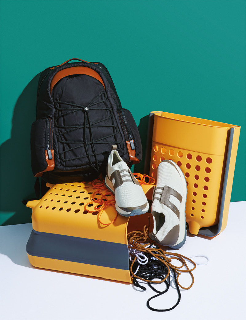 抽绳设计可以用在很多地方,作为鞋带、放置在包袋上、出现在裤子的一角或者成为提升腰线的小窍门,在不经意间实现更多趣味的可能性。 薄衬小牛皮拼接尼龙双肩包 9300元拼色针织袜式运动鞋 6700元均为Canali