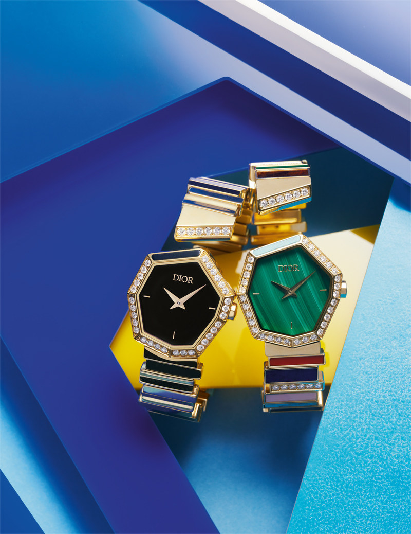 迪奥高级珠宝部艺术总监维多利亚·德卡斯特兰(VictorieDe Castellane)是一位创意频出的诗人般细腻的女性,在她的理念中,“时计和珠宝的交汇,无形亦无相”。新款Gem Dior时计正是这种珠宝手镯与腕表的结合体—— 表壳采用不规则造型,表链的错落拼接设计致敬了迪奥先生当初为高订时装秀遴选面料时,曾随手将面料样品固定在纸上而意外呈现的效果。整个系列的配色与宝石搭配非常丰富,采用的完全铰