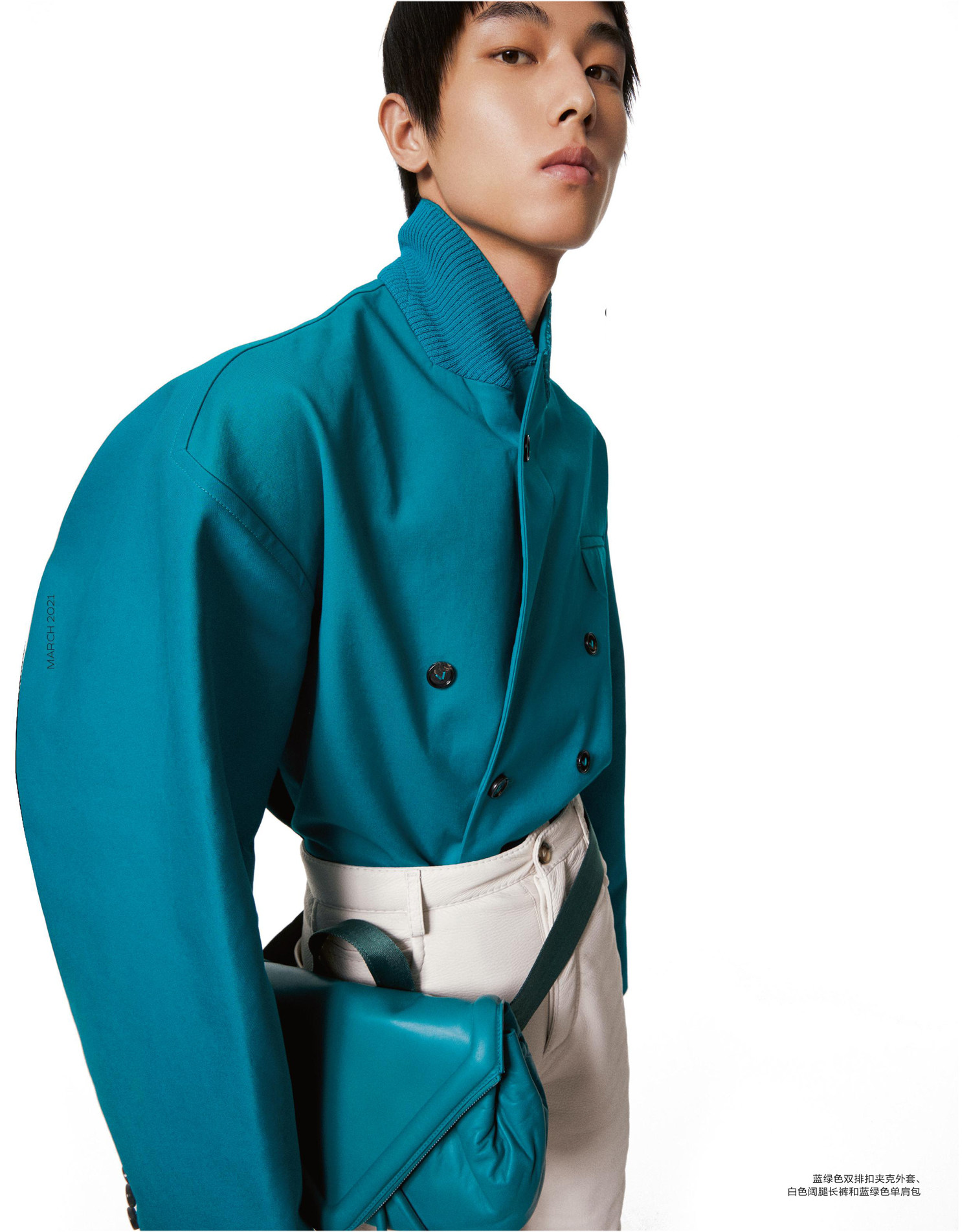 冠以任性自由的春季总与明快色彩、凌厉廓形或是新颖印花自动关联。尽管本季新系列在发布形式上曾被放逐在了端口的另一边,可就像注定到来的三月的风,充满浪漫与华丽、精良与复古、希望与思考的新一季时装正气势磅礴地无限贴近我们。 蓝绿色双排扣夹克外套、白色阔腿长裤和蓝绿色单肩包 · 殷闻泽橘色背带连体短裤、浅橘色长裤、蓝色印花镂空衬衫、黑色皮鞋和水晶首饰· 叶翔橘色翻领西装外套、橘色背带长裤和黑色短靴