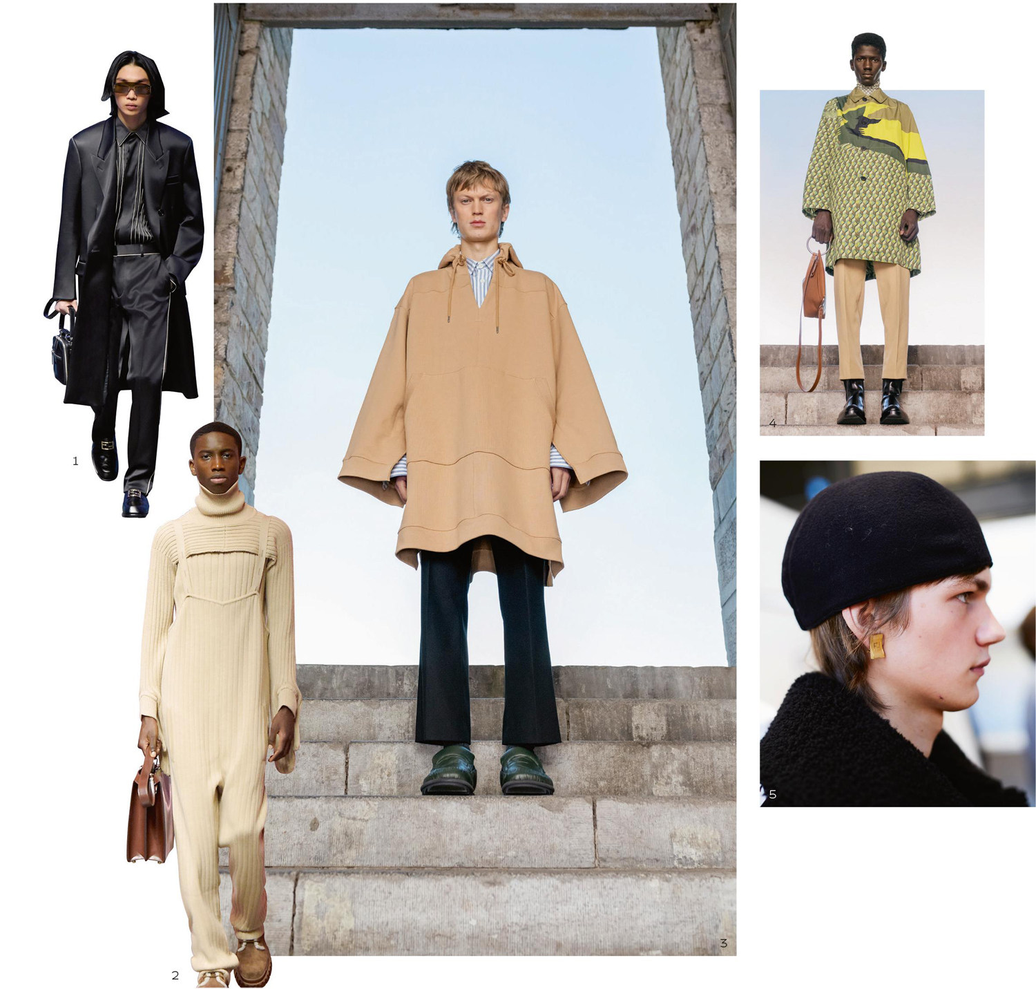 正如上述这些被重新构筑的建筑一样,Zegna展出的衣服是超现代的,其中又包含了对过去世界的回声。一些绒面革外套或毡状羊绒翻领在锁骨处开衩,或在臀部处被切割成口袋;精致的针织高领在喉咙处宽宽松松的,并具有可扣式袖口细节,为有领衬衫提供了新的替代品;日常服大衣,带有开衩的侧面,可让双手紧贴在舒适的内部口袋之中。以上款式及细节是Zegna一贯延续的对传统裁缝工艺的致敬,加上为了打破裁缝工艺受到历史与
