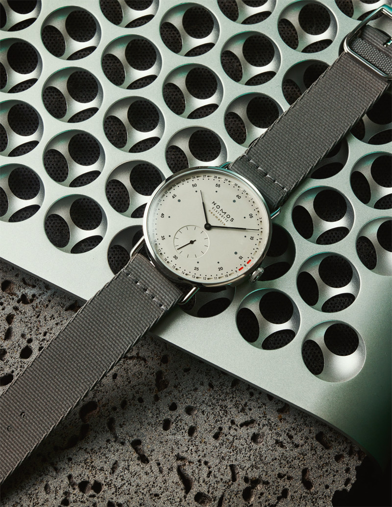 Metro neomatik41 Update腕表机芯:自制DUW 6101自动上链机械机芯,动力储存42小时功能:时、分,小秒针,环形日期显示,防水50米材质:精钢表壳,白色电镀银表盘,深灰色织物防水表带直径:40.5毫米NOMOS Glashütte35,000元 地铁线路是繁复笔直交错的,而柔软的生活似乎是环形往复。Met roneomatik 41 Update腕表最大的亮点正是它的环形