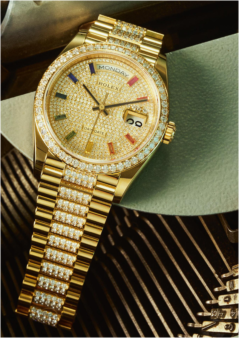 “The true is out there.”不算昏暗的上世纪90年代的小办公室,关于神秘事件的档案满柜子满桌面,老旧的电脑和打字机“吱噔”响着,录入这些神秘,录入这些巧夺天工的精技,还有宝石的隐藏秘密。 蚝式恒动星期日历型36腕表机芯:劳力士3255型机芯,动力储备约70小时功能:时、分、秒,星期,日历,防水100米材质:18ct黄金表壳;密镶钻石表盘搭配镶钻外圈,表盘设有10颗方形切割彩虹