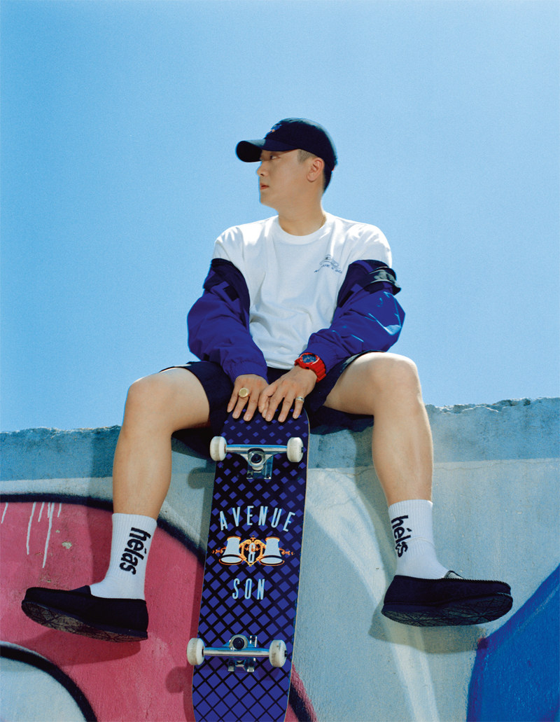 蓝色冲锋衣外套 Helas白色短袖 T Avenue & Son 白色短袖T Avenue & Son 绿色马甲上衣 Helas黑色运动裤 Avenue & Son迷彩涂鸦背包 Place 蓝色短袖上衣、渔夫帽 均为Helas 豹纹外套、牛仔长裤均为私人物品 谢汶凯BOSS Q:在滑板领域,你最引以为傲的一件事是什么? A:感觉做的每一件事都是,第一次拿冠
