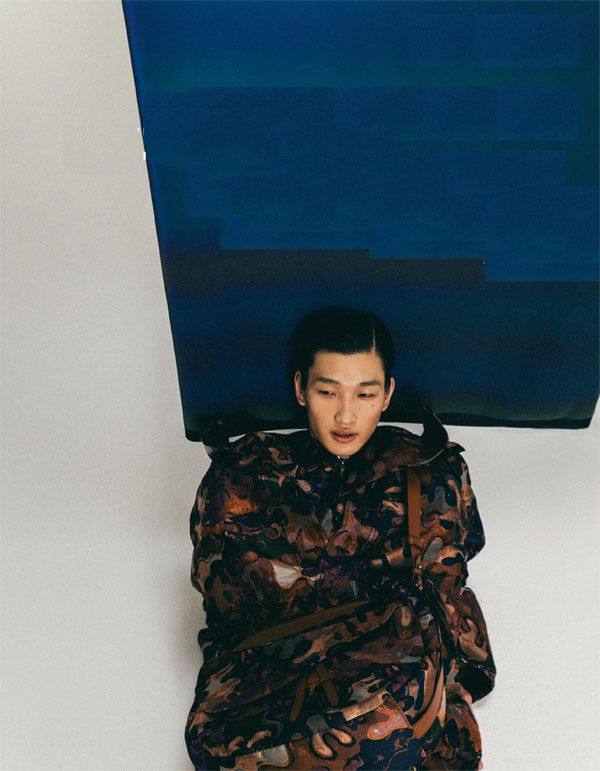 墨绿色皮革衬衫 Bottega Veneta 银色吊坠项链Dior 绿色格纹欧根纱外套、蓝色印花长裤和格纹拼接印花丝巾均为Louis Vuitton 军绿色图案无袖衬衫Burberry 绿色运动围裙Moncler 印花西装外套、印花短袖衬衫和灰色长裤 均为Louis Vuitton 蓝色印花polo短袖T恤和印花连帽上衣均为Versace 藏青色印花抽绳短裤Monc