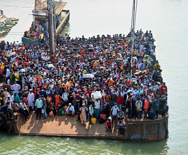 孟加拉国丨蒙希甘杰 2021年5月13日是穆斯林开斋节,一般会放假几天。如同中国人庆祝春节一样,开斋节前夕,在外工作的、做生意的、出差的穆斯林都会提前返乡,探亲、访友共度开斋节。尽管孟加拉国政府为抗击新冠肺炎疫情的传播,实施了严格的封锁,但仍有大量民众冒着风险集中返乡。浩大的返乡潮也如同“春运”一般,人潮汹涌。 图为2021年5月9日, 在孟加拉国蒙希甘杰,大批民众在等待渡轮。 5月12日,