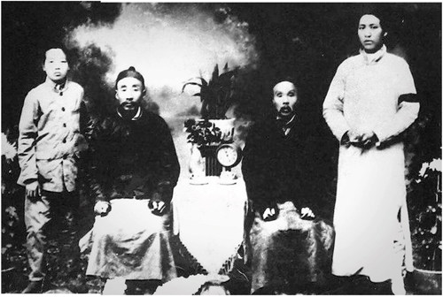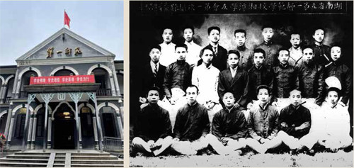 1919年,毛泽东(右一)同父亲毛贻昌(左二)、弟弟毛泽覃(左一)在长沙合影。 那个少年很不一样。 他瘦瘦高高的,头发有些蓬乱,走路很快,讲话语调却有些缓慢,带着明显的重音。他的眼睛很有神采,但肤色比其他同学黑,手掌也更粗糙。一身青大布的短褂和裤子,与那些穿学生装的、穿马褂系丝腰带的孩子相比,他不阔气也不时髦,但十分显眼。 这是17岁的毛泽东,第一次离开家乡韶山冲,自己挑着行李上新式学堂,刚