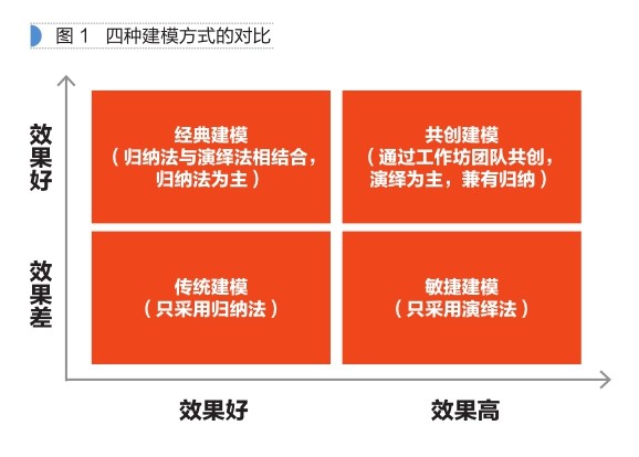 基于效率和效果维度的建模方法 市面上诸如快速建模、敏捷建模、工作坊建模等各种方法让人眼花缭乱、目不暇接,这些方法之间到底有何异同点?其实,胜任力模型的构建归根结底就是两种方法,一是归纳法,二是演绎法。 归纳法是指通过访谈调研,甄别目标群体中高绩效与一般绩效者在工作中表现出的不同特质,挖掘并归纳出实现绩效优异所需要的个人素质,进而形成胜任力模型。麦克利兰当时就是使用这种技术进行建模的。归纳法的主