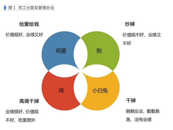 大道至简,大道相通。企业家共有的性格特质就是“狠”!然而,“狠”并不影响企业家格局与形象。被誉为“女版巴菲特”的“风投女王”徐新选择投资对象有三个标准:一是企业创始人要有杀手直觉,够快够“狠”,能够看到别人看不到的东西;二是学习速度要快,学习能力要强;三是志存高远,富有远见。她管理员工也够“狠”,她把员工分为明星、狗、鸡和小白兔四类并实行差异管理,见图1。 企业家之路并非一蹴而就,必须要经历“创
