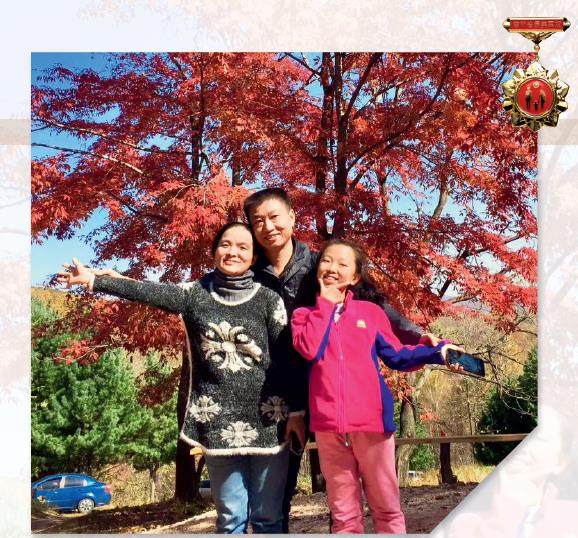 2017年10月,艾碧一家在吉林临江枫林林场 艾碧 重庆綦江人,汉族,1978年9月出生,2003年9月参加工作,现为临江市商务局科员。曾获“白山好人·十佳最美女性——最美军嫂”“吉林好人标兵”等荣誉,2020年被中央文明办评为“孝老爱亲好人”。2006年5月结婚。丈夫蒋德红,重庆铜梁人,32117部队二级军士长,荣立一等功1次、二等功2次、三等功3次,获全国、全军“法制宣传教育先进个人”,“