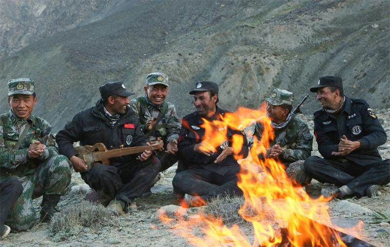 与边防官兵一起巡逻间隙,拉齐尼·巴依卡(左二)弹唱歌曲 擦拭墓碑,敬献鲜花……2021年清明时节,帕米尔高原上柳绿花开,全国各地慕名而来的人们在拉齐尼·巴依卡(以下简称“拉齐尼”)墓前表达哀思、缅怀英雄。 2021年1月4日,被誉为“帕米尔雄鹰”的第十三届全国人大代表、全国劳动模范、共产党员拉齐尼为救落入冰窟的儿童英勇牺牲,生命永远定格在了41岁。“帕米尔雄鹰”已逝,但英雄家庭祖孙三代爱国戍边