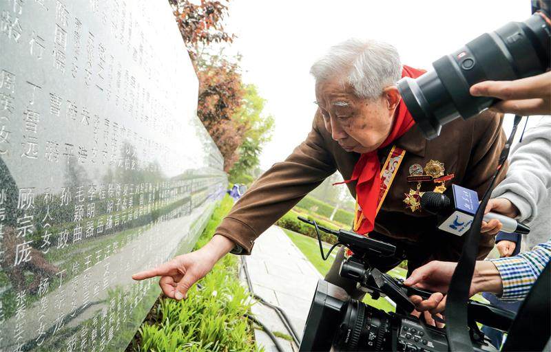 2021年4月2日,新四军老战士刘天同在纪念墙上寻找战友名字 击鼓鸣钟、诵读祭文、敬酒奉茶。伴随着恢弘庄重的音乐,“百年青春、百年信仰、百年愿望——2021年上海市社会各界清明感恩典礼”,于4月2日在上海福寿园新四军广场举行。 新四军老战士冯国樑、刘天同,来自上海市新四军历史研究会、上海市公安局刑事侦查总队、新四军老战士合唱团、青浦区夏阳街道、东门小学的社会各界人士及先烈先贤家属代表等百余人参