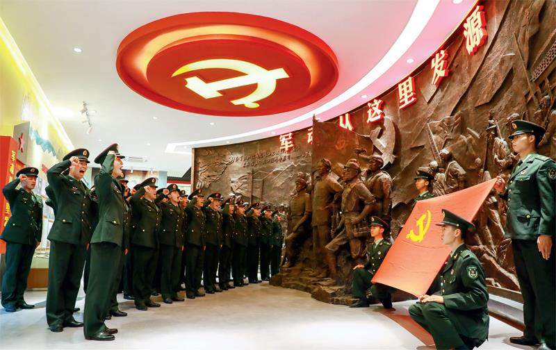 2021年5月,“红一连”在连史馆举行党员重温入党誓词活动。摄影/张增岩 “党对军队的绝对领导,是我军的军魂和‘命根子’,永远不能变,永远不能丢。”2021年7月,陆军第83集团军某旅“红一连”被中共中央宣传部授予“时代楷模”称号,该旅旅长杨金龙接受笔者采访时这样说。 1927年“三湾改编”时,毛泽东亲自在这个连队发展了6名新党员,建立了全军第一个连队党支部,开创了我军“支部建在连上”的先河,