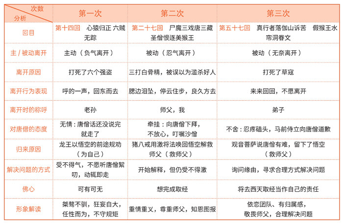 整部《西游记》有两条线索:一条是明线,即取经团队在十万八千里的取经路上克服八十一难,取得真经;一条是暗线,即孙悟空的心灵成长。他集兽性、人性和神性为一身,“也能善,也能恶,眼前善恶凭他作。善时成佛与成仙,恶处披毛并带角”。这使他的成长充满了矛盾冲突,不仅在故事层面使小说好看,更是在价值观方面给我们多种启发。 本期名著赏析将梳理孙悟空取经过程中的“三次离开”,让同学们能更清晰地感知孙悟空由魔成佛的