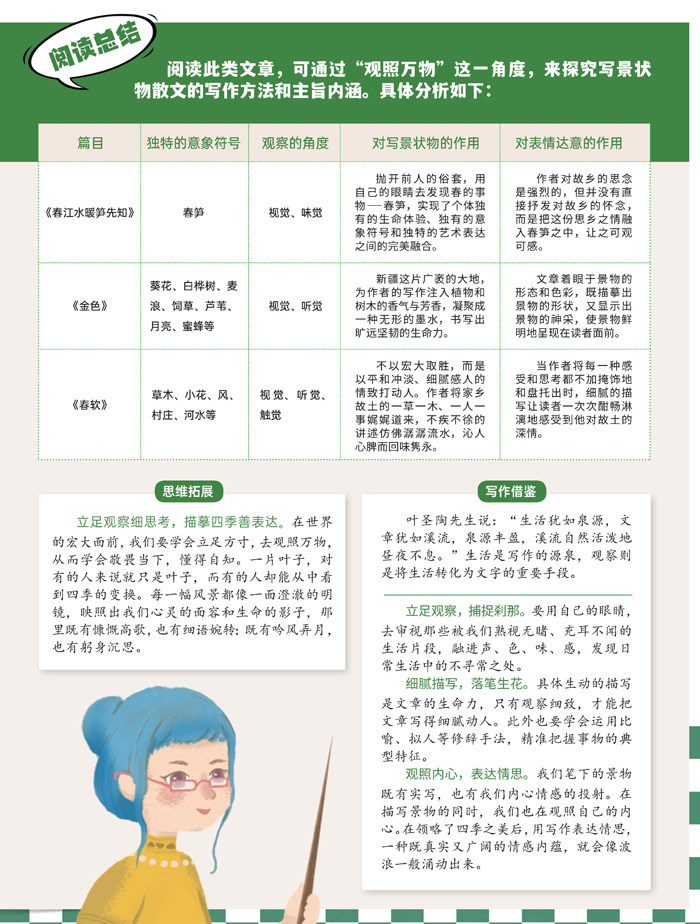 阅读此类文章,可通过“观照万物”这一角度,来探究写景状物散文的写作方法和主旨内涵。具体分析如下: 思维拓展 立足观察细思考,描摹四季善表达。在世界的宏大面前,我们要学会立足方寸,去观照万物,从而学会敬畏当下,懂得自知。一片叶子,对有的人来说就只是叶子,而有的人却能从中看到四季的变换。每一幅风景都像一面澄澈的明镜,映照出我们心灵的面容和生命的影子,那里既有慷慨高歌,也有细语婉转;既有吟风弄月,也