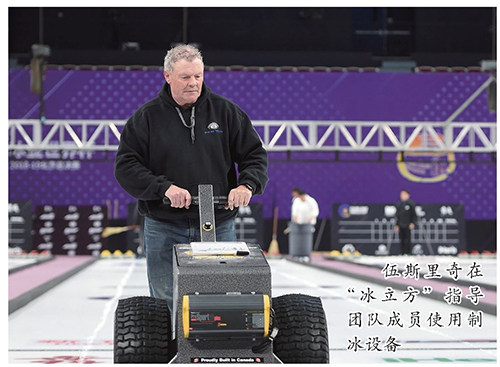 在中国的冬奥场馆,我采访了一些优秀的外国制冰师。2019年5月,在北京举办的世界冰壶锦标赛中,我亲眼看到中国冰壶队战胜了加拿大冰壶2队,这里有运动员的付出,更有外国教练的功劳。 有一位加拿大制冰师叫汉斯·伍斯里奇,提起他我就想掉眼泪。我曾经把汉斯推扫冰车的照片发给加拿大冰雪专家柯路奇,他赞叹道:“他是世界上最好的制冰师。” 照片勾起了我的回忆,2019年11月16日傍晚,国家游泳中心场馆运行部