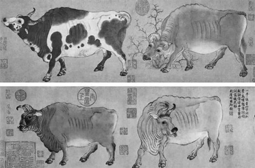 现珍藏于北京故宫博物院的唐代名画《五牛图》,是国宝级珍贵文物,它的回归经历了1300年的曲折,数次易主,最后终于被国家高价购回并珍藏。 《五牛图》是唐朝韩混所绘。韩混是唐朝宰相,历经玄宗、肃宗、代宗、德宗四朝,是著名的政治家和画家。 中国是一个农耕民族,是以农业为立国之本的国家,自古以来耕地就以牛为主。《五牛图》卷,纸本,设色,纵20.8cm,横139.8cm。本图无作者款印,本幅及尾纸上有赵