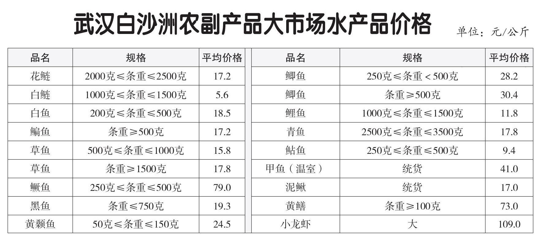 武汉白沙洲农副产品大市场水产品价格