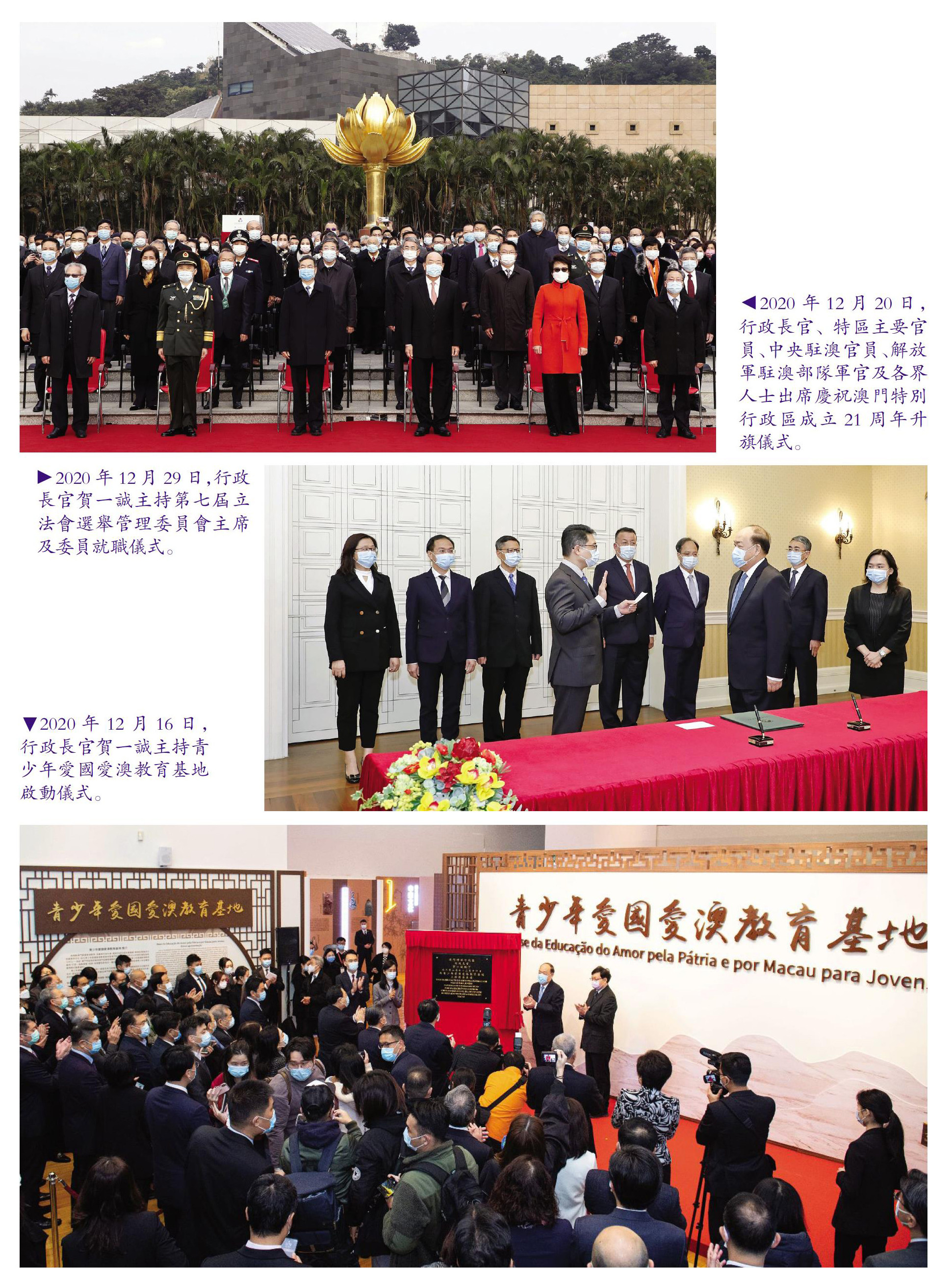 2020年12月20日,行政長官、特區主要官員、中央駐澳官員、解放軍駐澳部隊軍官及各界人士出席慶祝澳門特別行政區成立21周年升旗儀式。 2020年12月29日,行政長官賀一誠主持第七屆立法會選舉管理委員會主席及委員就職儀式。 2020年12月16日,行政長官賀一誠主持青少年愛國愛澳教育基地啟動儀式。 2020年12月20日,行政長官賀一誠等在慶祝澳門特別行政區成立21周年招待酒會上向在