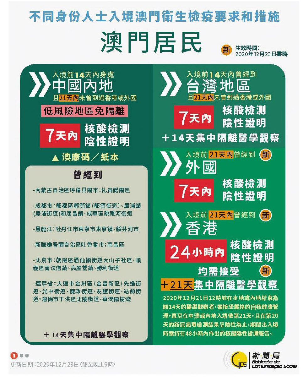 本澳新型冠狀病毒感染應變協調中心12月23日向全澳公佈強化疫情防控新要求,一是自2020年12月24日起,市民可在澳門健康碼系統上補充登記“在澳常居地點”,也可選擇授權衛生局,在出現疫情時向身份證明局提取登記的住址資料;如不在澳居住,則填上“在澳經常活動地點”,如過去14日在澳經常活動(如工作、學習)的地點,以及預定在澳旅程中經常逗留的地點(如賭場、酒店、會展、宴會等)。二是除內地和臺灣地區外的