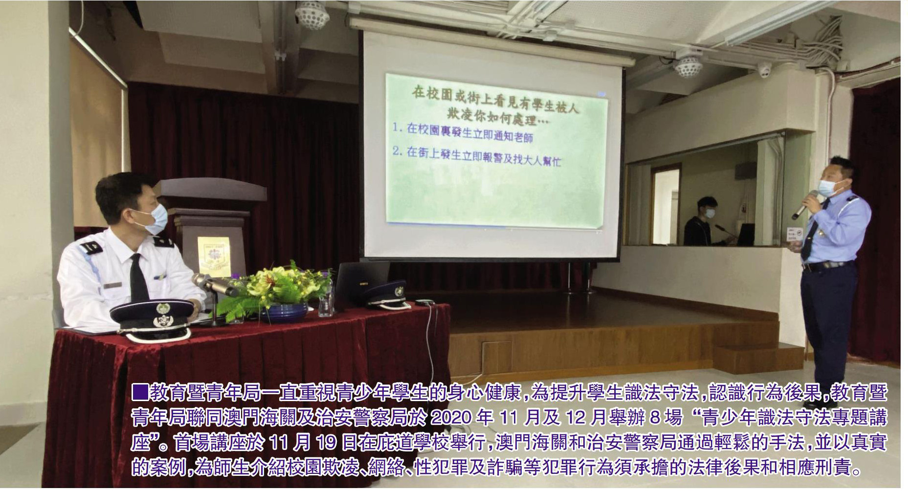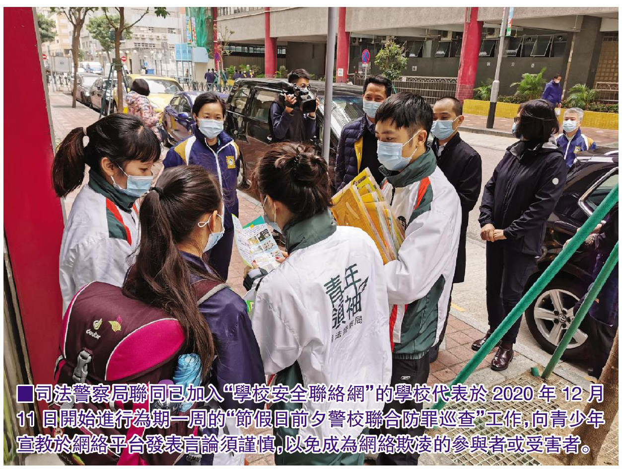 是否認同從法律層面上加強防治網絡欺凌? 澳門司法警察局關注少年組職務主管趙朱惠敏:我們持續到本澳各學校舉辦以學生為對象的“傷人與欺凌”及“電腦犯罪與網絡欺凌”防罪講座,並從網絡欺凌所衍生的傷人、勒索、恐嚇、脅迫、搶劫等犯罪出發,向學生宣教相關法律知識,並讓他們清楚明白相關欺凌行徑可帶來嚴重後果;亦教導學生如何應對網絡欺凌事件,避免成為網絡欺凌的參與者或受害者。 2019年,司警局共舉辦4