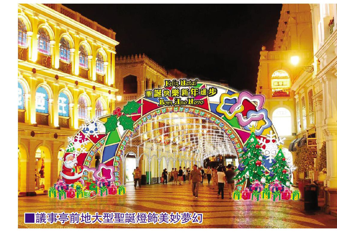 聖誕燈飾閃耀澳門 澳門市政署於全澳各區不同地點佈置繽紛的燈飾,在各主要街道安裝LED碎燈及燈牌,在公園及圓形地等安裝聖誕樹、大型聖誕彩球等大型燈飾,讓市民及遊客感受到濃濃的聖誕及新年歡樂氣氛。除了各區燈飾,市政署大樓、仁慈堂、郵政局等議事亭前地一帶的葡式建築,亦美輪美奐。市政署的大堂展示耶穌降生的馬槽場景,花園中央以大型的聖誕樹配以聖誕花及各色聖誕飾物為設計重點,旁邊佈置小型聖誕樹、聖誕鹿等作為