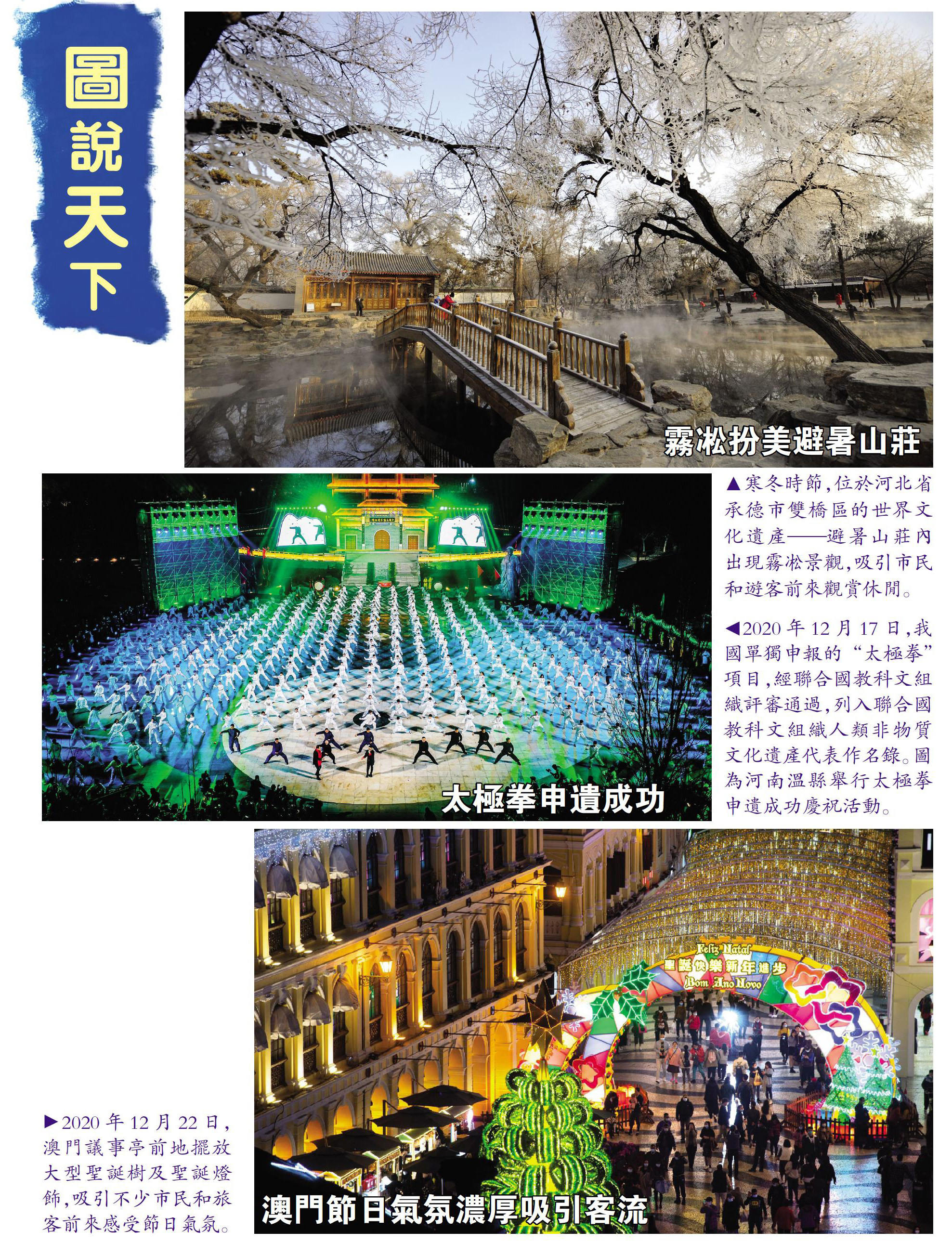 霧凇扮美避暑山莊 ▲寒冬時節,位於河北省承德市雙橋區的世界文化遺產——避暑山莊內出現霧凇景觀,吸引市民和遊客前來觀賞休閒。 2020年12月17日,我國單獨申報的“太極拳”項目,經聯合國教科文組織評審通過,列入聯合國教科文組織人類非物質文化遺產代表作名錄。圖為河南溫縣舉行太極拳申遺成功慶祝活動。 2020年12月22日,澳門議事亭前地擺放大型聖誕樹及聖誕燈飾,吸引不少市民和旅客前來感受節