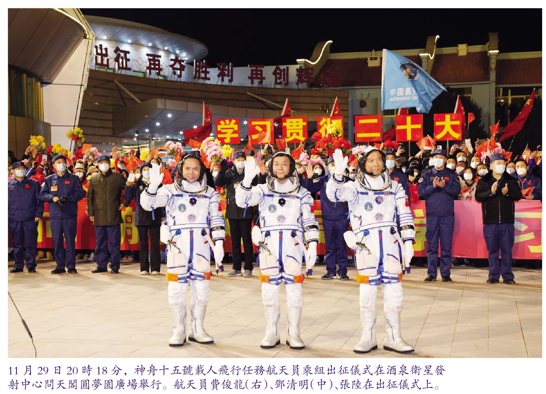 11月29日20時18分,神舟十五號載人飛行任務航天員乘組出征儀式在酒泉衛星發射中心問天閣圓夢園廣場舉行。航天員費俊龍(右)、鄧清明(中)、張陸在出征儀式上。 11月29日,搭載神舟十五號載人飛船的長征二號F遙十五運載火箭在酒泉衛星發射中心點火發射。 11月30日在酒泉衛星發射中心拍攝的神舟十五號載人飛船與天和核心艙自主快速交會對接的模擬圖像。 11月30日在酒泉衛星發射中心拍攝的神舟十五號