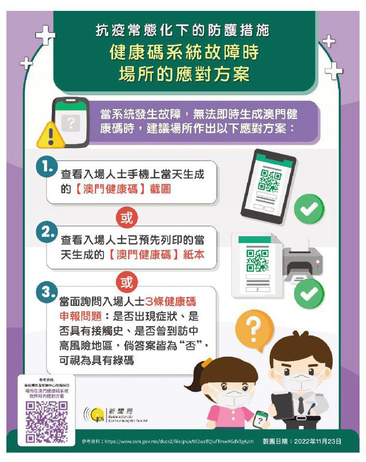 澳門健康碼於11月8日晚上10時因伺服器出現異常情況,導致無法生成健康碼,雖然經當局搶修後已恢復運作,但在次日不同時段再次先後出現故障,其中部分故障時段為出入境高峰期,令大批人士聚集於關閘口岸出入境大堂,無法順利通關;部份跨境學生原地滯留,需待系統恢復正常後才能入境上學。事件除引起居民不滿,亦造成人群聚集,增加病毒傳播風險,影響防疫工作。 類似的防疫工作安排不當問題在不久前亦有發生。10月3