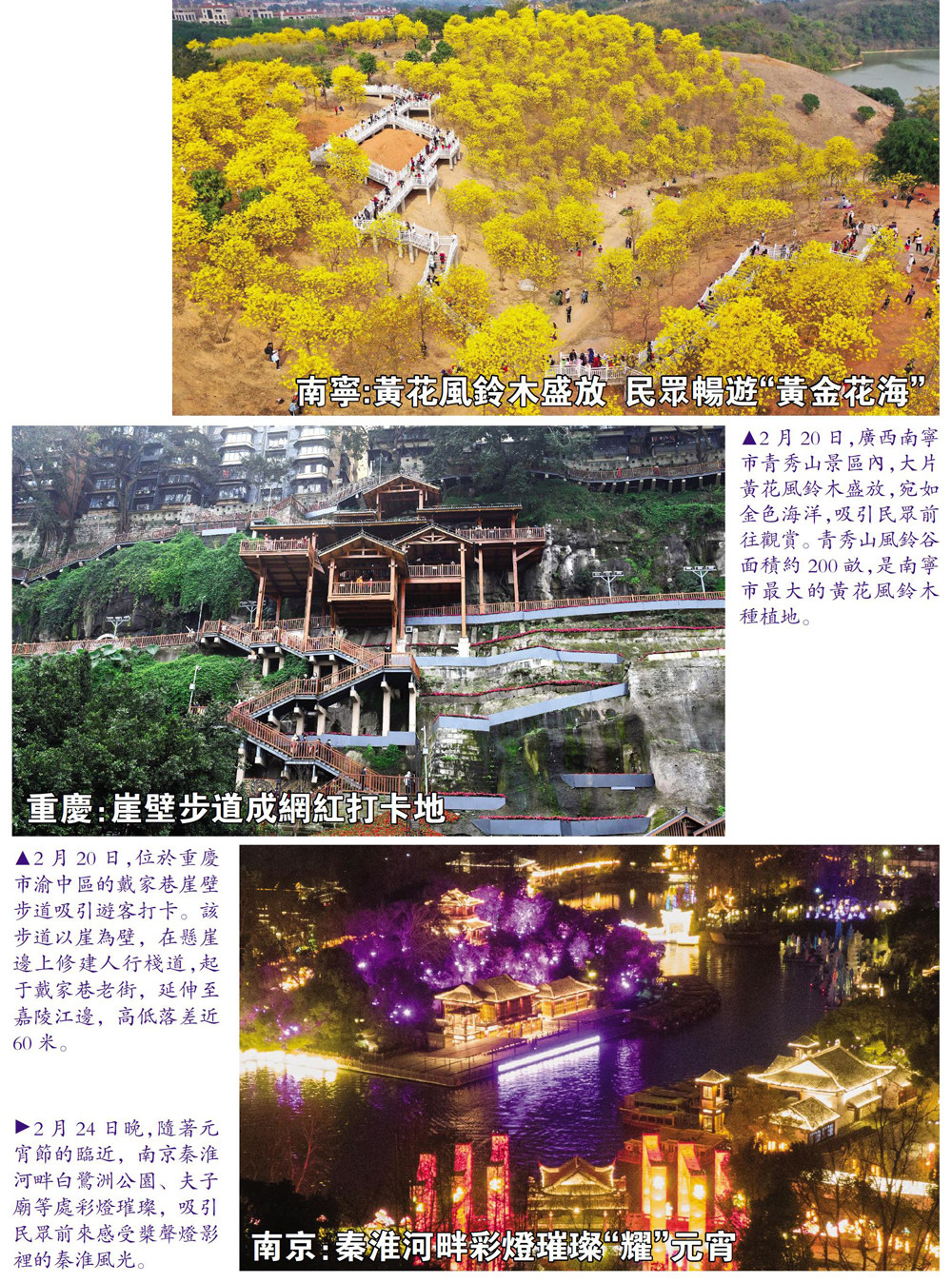 南寧:黃花風鈴木盛放 民眾暢遊“黃金花海” 2月20日,廣西南寧市青秀山景區內,大片黃花風鈴木盛放,宛如金色海洋,吸引民眾前往觀賞。青秀山風鈴谷面積約200畝,是南寧市最大的黃花風鈴木種植地。 重慶:崖壁步道成網紅打卡地 2月20日,位於重慶市渝中區的戴家巷崖壁步道吸引遊客打卡。該步道以崖為壁,在懸崖邊上修建人行棧道,起于戴家巷老街,延伸至嘉陵江邊,高低落差近60米。 2月24日晚,隨著元