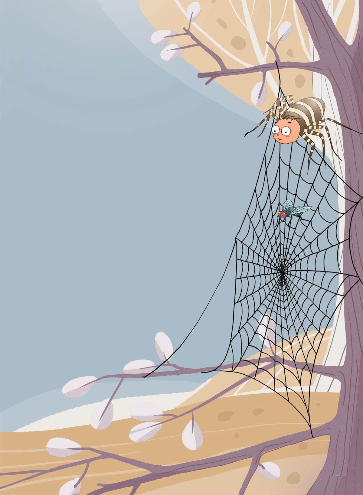 昨夜一场好厉害的暴风雨,夹杂着大小不一的冰雹,整整持续了三个钟头,把蜘蛛家的那张网撕了个稀巴烂。 小蜘蛛被惊吓得藏到树洞里,屏声静气,再也不敢出来。 “娃娃崽,”蜘蛛妈妈招呼他,“快出来晒晒太阳吧!娃娃崽,天晴啦!” 小蜘蛛从树洞里探出头,知道没有了风和雨,没有了冰雹,才慢慢爬出来。他一见他家的网已经不再是网,就替妈妈发愁。 “妈妈,我们家没有网了!” “有!有网!”蜘蛛妈妈说,“就算有