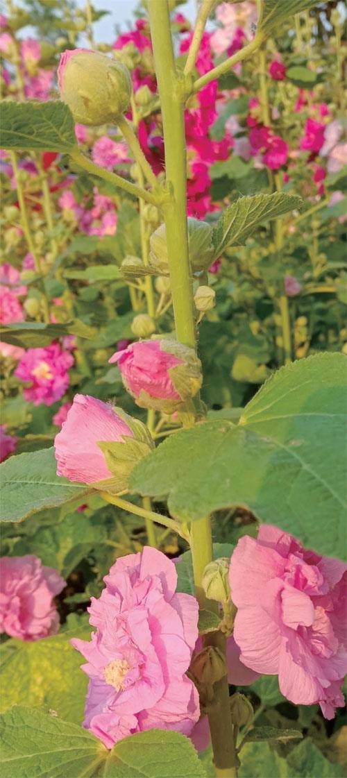 每一种植物都有自己的个性、爱好和生活习惯,人类几乎改变不了它们。 秫秸(shú jie)花是乡下人对蜀葵的一种叫法,我认为极为形象。进入四月,它们陆续破土而出,一秆一秆的,都长得高高的,直直的,像极了农村的秫秸。这种花不需要刻意栽种,无论在哪里落下种子,都会一下长出一大片,看上去既朴素又茁壮。 秫秸花的秆,通体青色,叶大而厚,基本上呈心形,带有浅浅的五裂或七裂。最奇妙的是它的花骨朵儿,青色的花