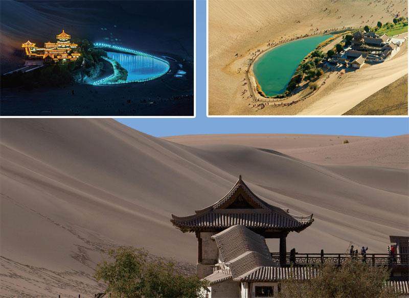 “敦煌城南山鸣沙,中有大泉古渥洼。后人好古浑不识,但从形似名月牙。”这是清代诗人苏履吉描写月牙泉的诗。从诗中不难读出,这清泉位居甘肃省敦煌市南边的鸣沙山,形似月牙,有“沙漠第一泉”之称,自汉朝起即为“敦煌八景”之一,1994年被列入国家级风景名胜区。 “沙漠奇观”月牙泉 月牙泉是敦煌诸多自然景观中的佼佼者,古往今来以“沙漠奇观”著称于世,被誉为“塞外风光之一绝”。月牙泉古称沙井,俗名药泉,南北