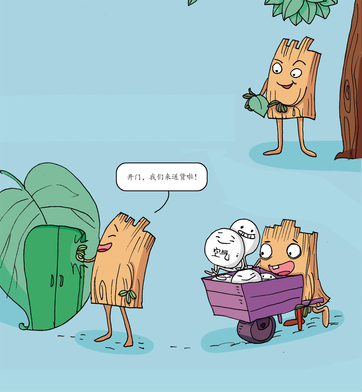植物的叶子看起来平淡无奇,人们再熟悉不过了,其实每片叶子里都藏着很多“生产工厂”。虽然听不到机器的轰鸣声,但这些“工厂”每天都在忙碌着。 叶子上藏有许多看不到的小孔,可以让空气进去。空气中的二氧化碳和根运来的水,就是叶片“工厂”的生产原料。 “工厂”开工需要太阳光。大部分的叶片宽大平展,就像一块块太阳能板,以便能够接受更多的太阳光。 有了水和二氧化碳,在阳光的照射下,叶片就开始工作了。它将水