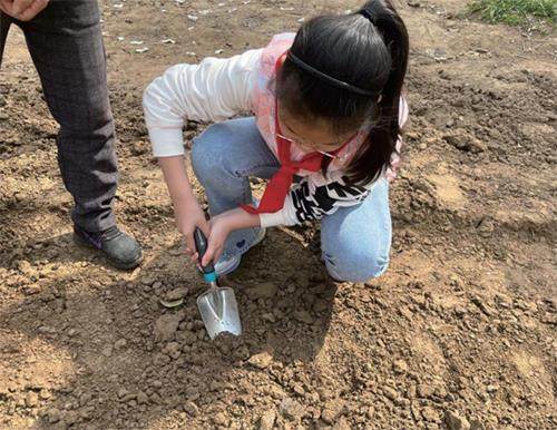 阳春三月,风儿吹起了口哨,小草冒出了嫩绿的脑袋。上午第三节课后,我们终于要去菜地播种了。 一到那儿,便发现爷爷奶奶们早已将土地平整好。一位奶奶蹲下身,开始给我们做示范。只见她先用右手拿着小铲子,在地上挖了一个小坑,接着左手捡了两粒豇豆种子放进坑里,最后用小铲子将坑填平,整套动作看起来如行云流水一般。奶奶告诉我们:“每个坑放两到三粒豆子,是为了防止有些种子长不出来。坑不能太深,也不能太浅……”没等