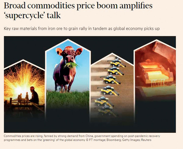 近几周来,大宗商品市场全面而强劲反弹势头不断增强,这令一些交易员和分析师预期,随着全球大型经济体同步加速,“超级周期”已经启动。 来自全球市场的逐步复苏、后疫情时代各国政府在经济复苏上的支出激增,以及对世界经济“绿化”的押注,推高了许多重要原材料的价格。 原材料价格上涨,覆盖广且势头强劲 4月底,钢铁生产所需的铁矿石、汽车制造所需钯(限制有害气体排放)以及木材价格均创下历史新高。包括谷物、油