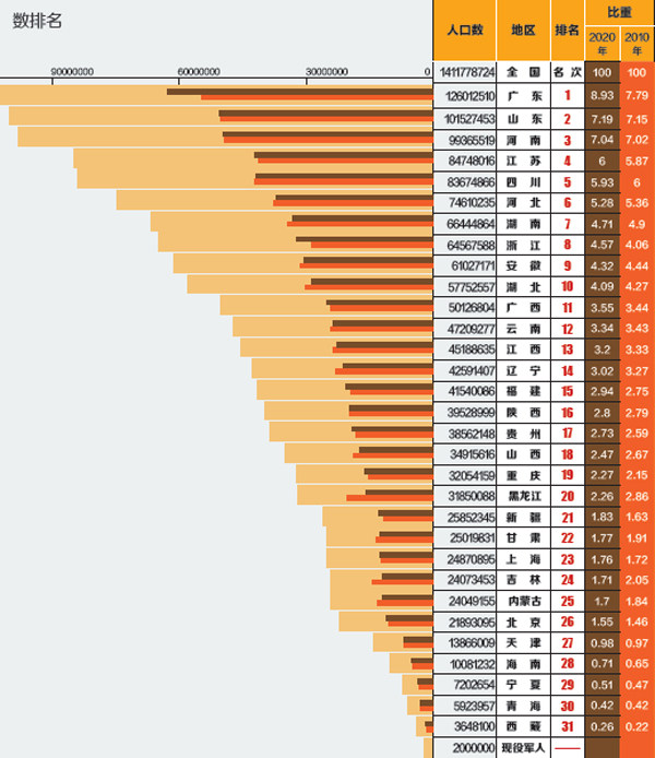 国家统计局5月11日公布的第七次全国人口普查(以下简称“七普”)中关于地区人口数据,展现了31个省份不一样的人口家底。 统计显示,在31个省份中,人口超过1亿人的省份有两个,人口在5000万人至1亿人之间的省份有9个,人口在1000万人至5000万人之间的省份有17个,人口少于1000万人的省份有3个。其中,人口居前五位的省份合计人口占全国人口比重为35.09%。 《中国经济周刊》记者将两个人