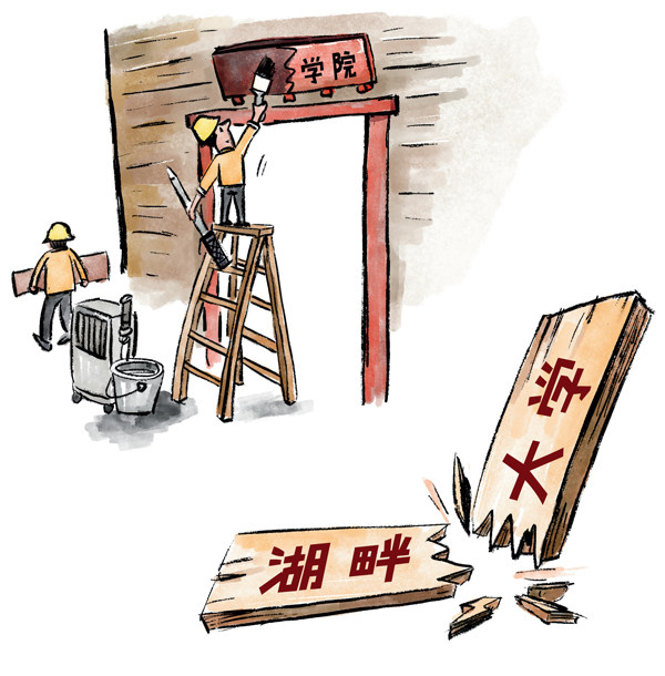 这两天,一段视频挺受关注:工人正从刻有“湖畔大学”字样的石头上清除“大学”二字。有人问:这是干啥?不让办了吗? 新闻得连起来看。最近,教育部等八部门联合下发《关于规范“大学”“学院”名称登记使用的意见》,明确提出,除经批准设立的大学、学院以及由其设立的内部机构或由其登记的组织机构外,其他组织机构不得在牌匾、广告等对外宣传以及其他各类活动中使用“大学”“学院”字样。 这事很值得说道。 一